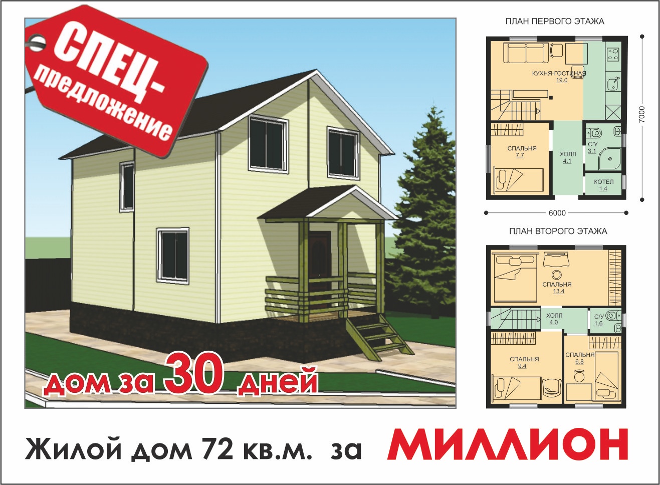 Только до 30 июня 2017 г. самый популярный проект последних двух лет — Дом 72 м2 — всего за МИЛЛИОН рублей. В стоимость включено всё — материалы, работа, доставка, проект и т.д., от вас только участок. Ваша экономия составит 40 000 РУБ. Спешите! Ждем вас в Выставочном доме-офисе с 8 до 17 часов ежедневно, включая выходные, по адресу: Каменная, 2.
